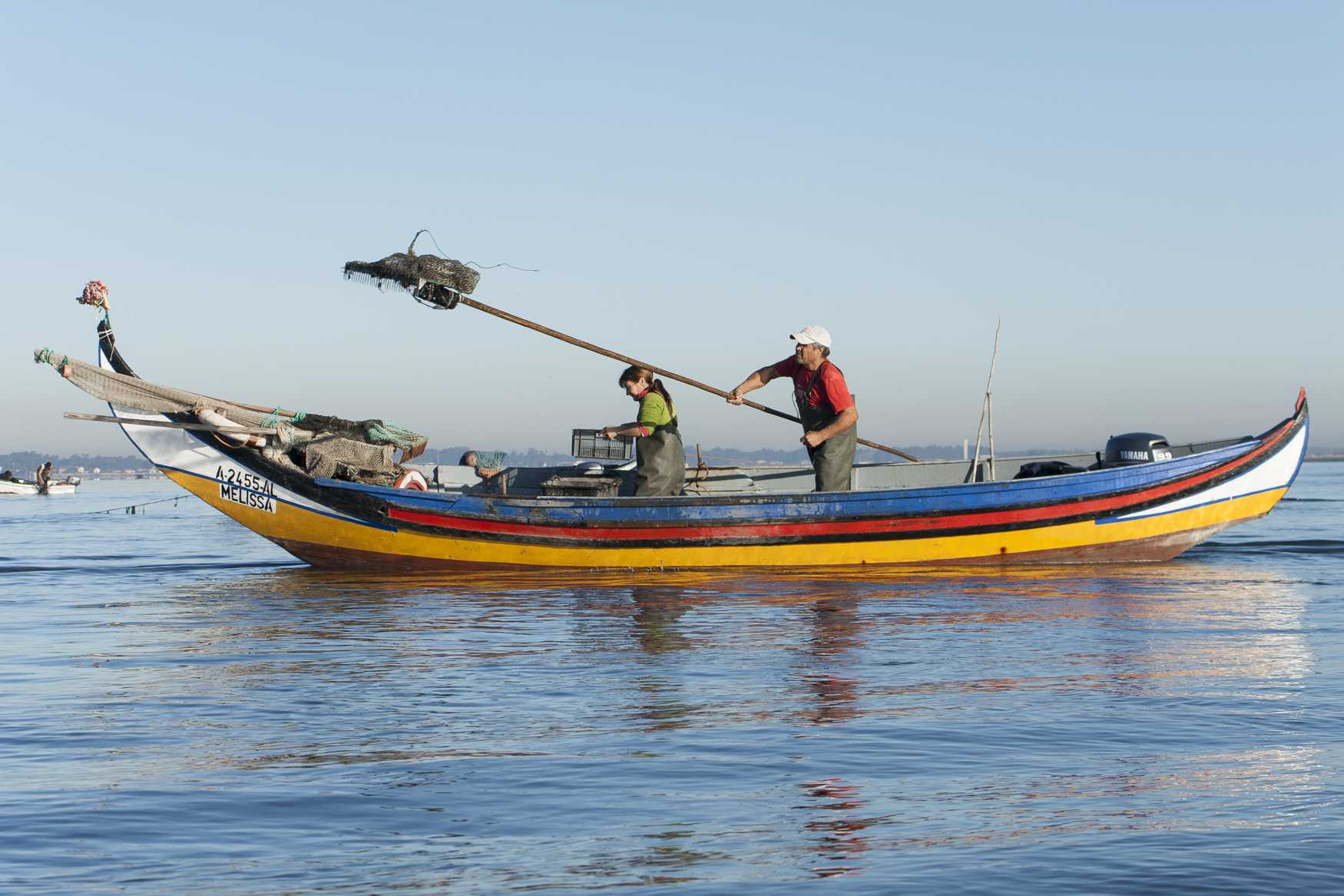 Os mariscadores na Ria de Aveiro no seu trabalho diário na apanha de bivalves. Esta exploração dos recursos da ria